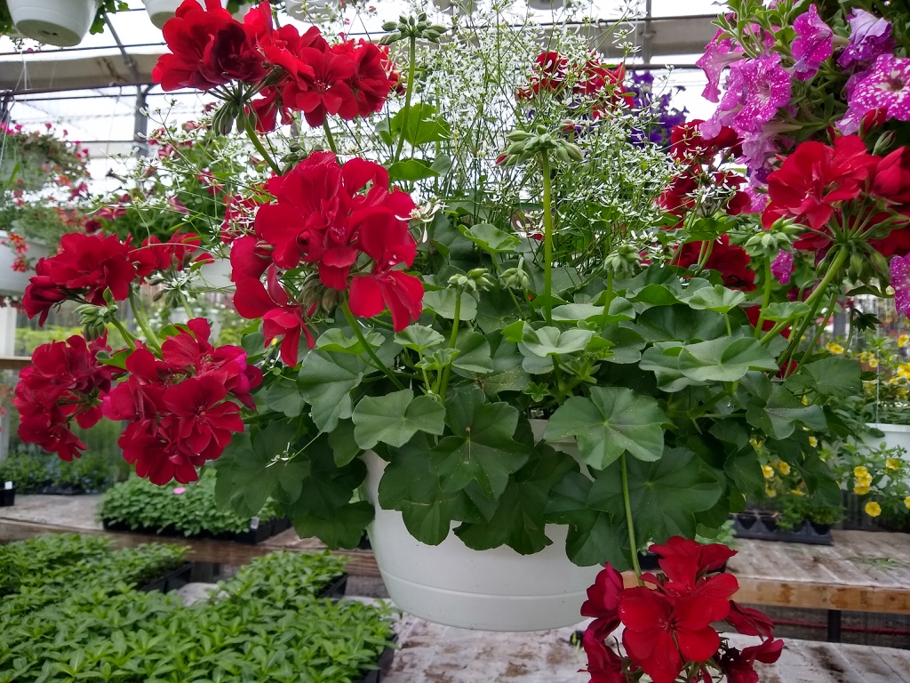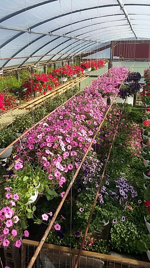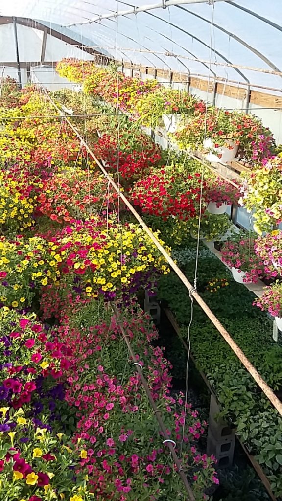 We grow a large variety of garden vegetables in 4 packs as well as. 4 pack flowers, 4″ pots ( flowers), hanging baskets and combination pots for patios and decks.